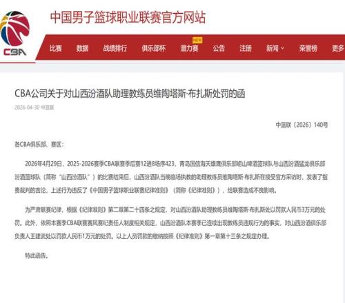 刚刚,CBA公司给山西队开出了一份大罚单!对助理教练陶塔斯·布扎斯l罚款30000元,对王建武罚款10000元。