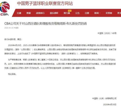 在山西男篮通过加时赛战胜了青岛男篮后,担任球队代理主教练的外籍助教布扎斯在接受采访时发表了不当言论,他直言裁判的吹罚有些偏颇,山西男篮在场上是五打八。对此,CBA官方对布扎斯开出罚单,对其罚款三万元。