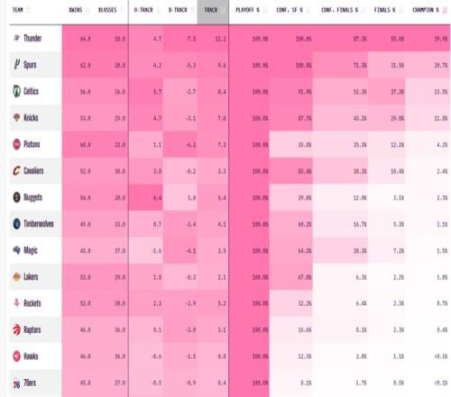 6队不足5%:湖人1%、魔术1.5%、森林狼2.1%、掘金2.3%、骑士2.4%、活塞4.2%