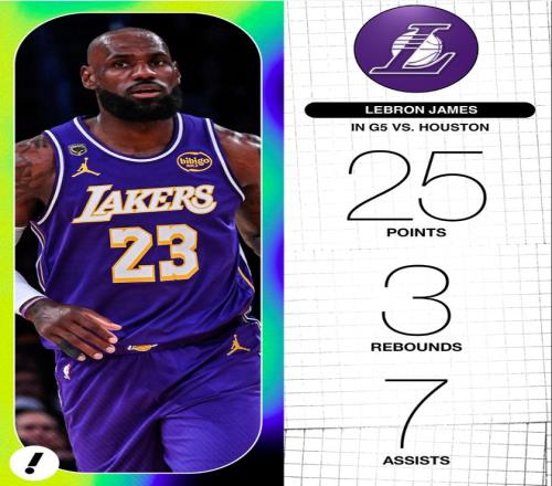 詹姆斯此役39分钟,20中9,三分6中0,罚球10中7,拿到25分7助攻3篮板2抢断2失误,命中率45%,三分命中率0%,真实命中率51.2%,正负值-5。终场前27秒与终场前12秒都三分打铁,这两个关键球没进比赛就走向完结。