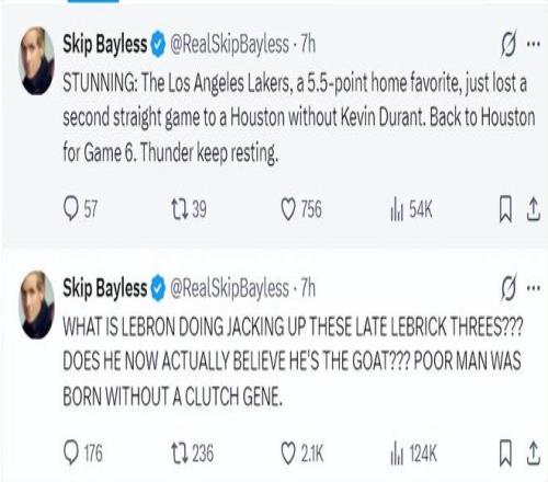 赛后名嘴斯利普-贝勒斯谈到詹姆斯在G5中的表现,他说道:詹姆斯为什么要在关键时刻出手外线?他真的觉得自己是GPAT吗?可怜的家伙生来就缺少关键时刻的基因。湖人已经连续输给没有KD的火箭两场,接下来将去休斯顿打第六场,雷布朗该如何调整?